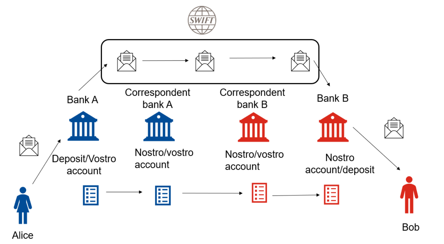 The actual currency exchange happens between Correspondent Bank A and Correspondent Bank B: The latter receives 10 USD in deposits at Correspondent Bank A.